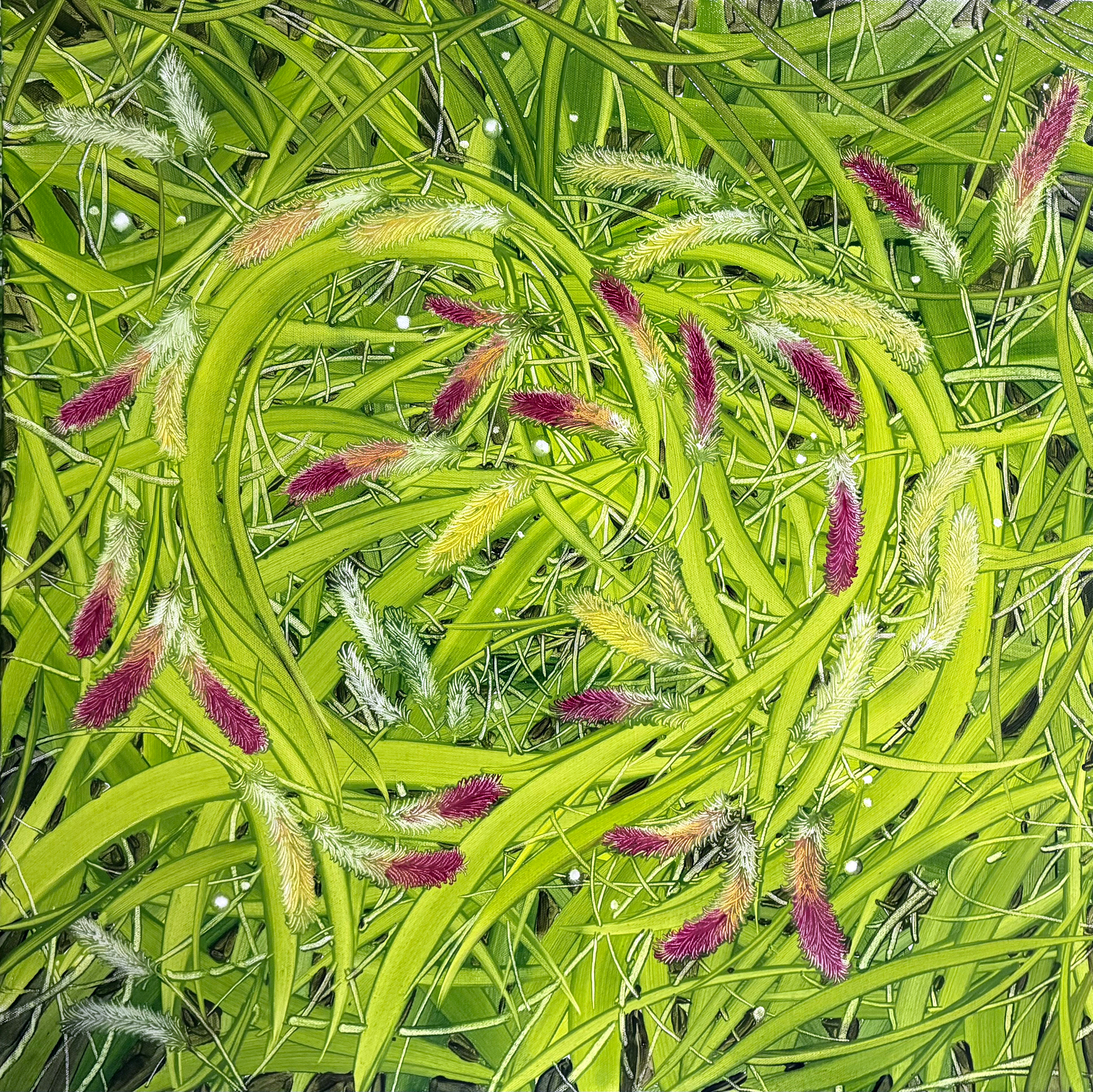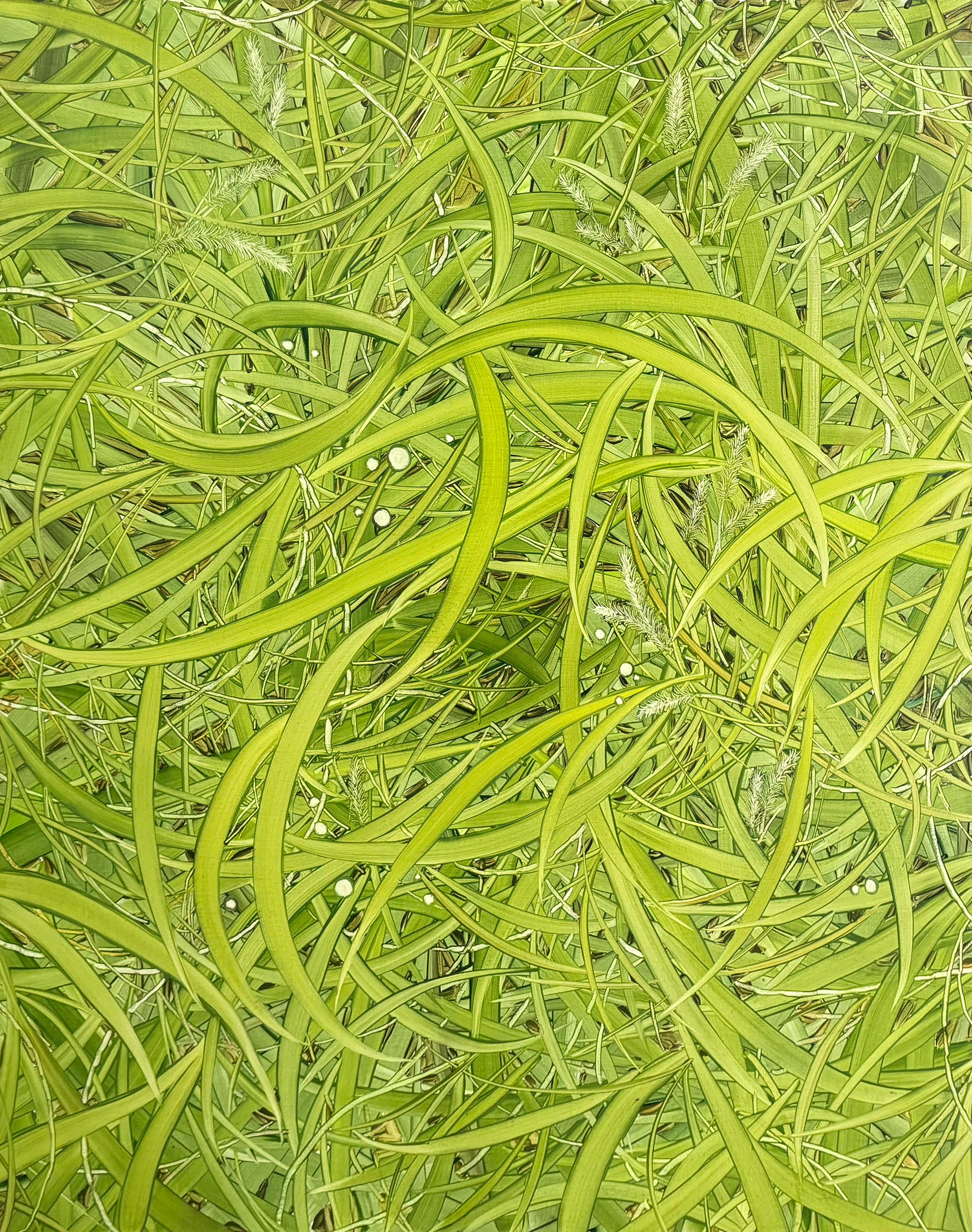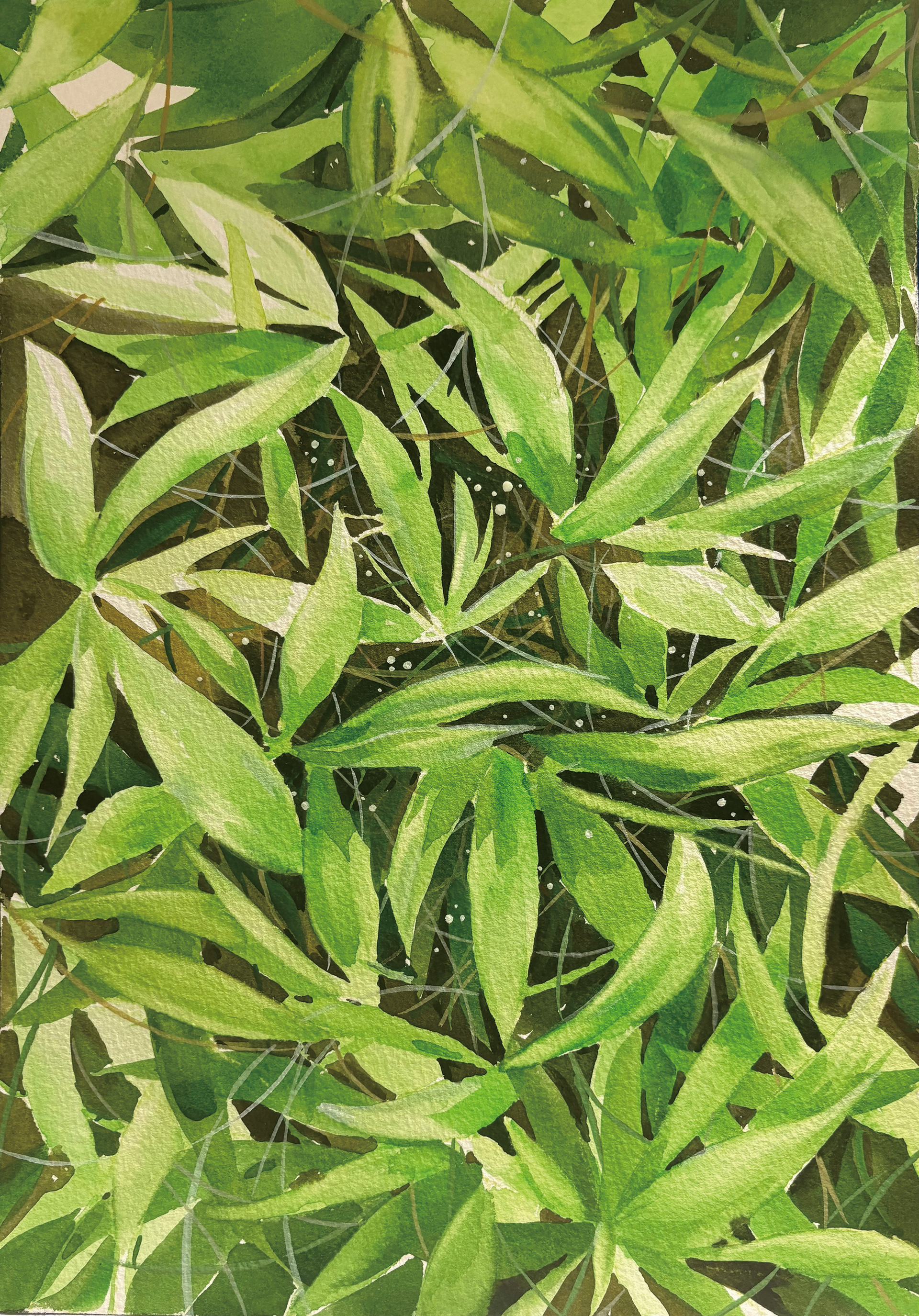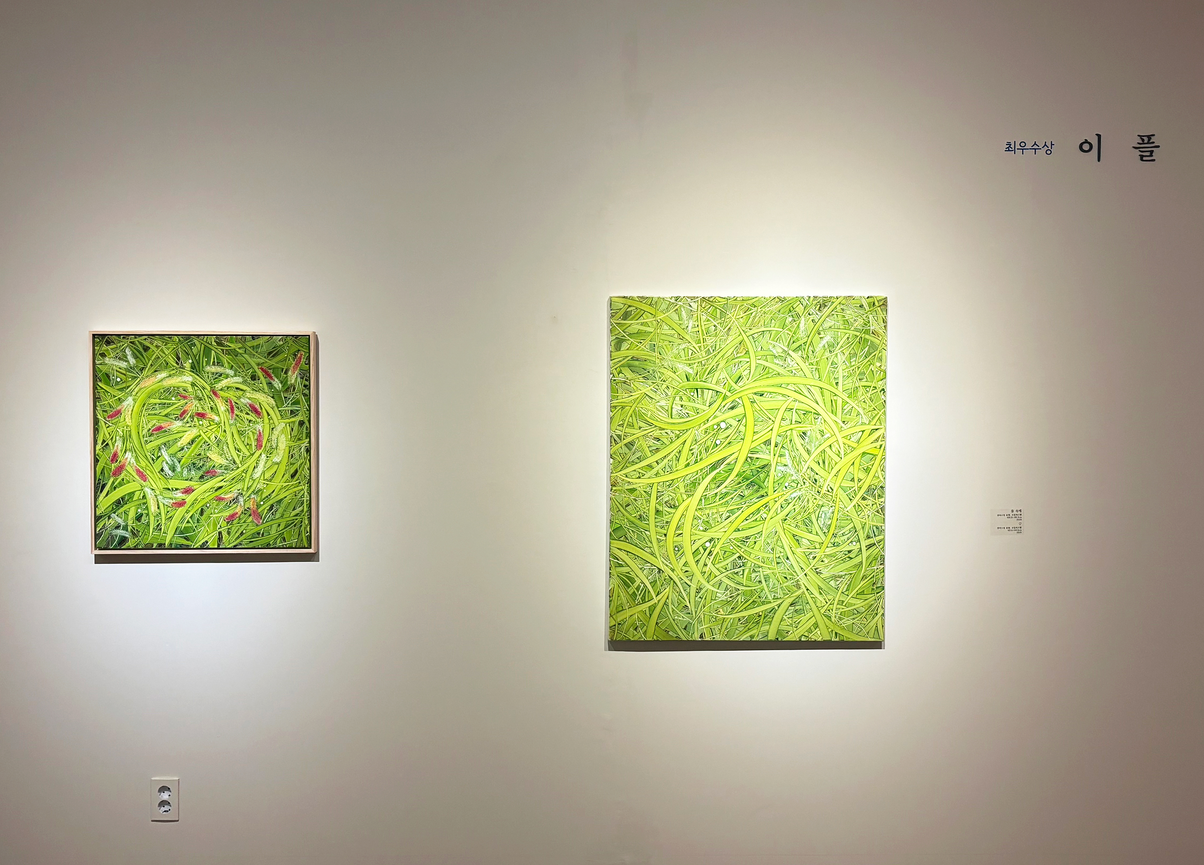 이플 작가는 자신이 마주하고 관계를 맺는 세계에 관심을 두고 있습니다. 작가에게 세계는 우연히 마주치는, 길에서 흔히 볼 수 있는 풀로 표현됩니다. 반려견과 함께 산책을 하며 풀 사이에 숨겨진 작은 생명들을 발견하고, 이를 화폭에 담아내고자 합니다. 작가가 바라보는 풀은 작은 생명체에게 집이자 쉼터가 되어주는 존재로, 수많은 관계 속에서 살아가는 또 하나의 삶이자 우주로 이해됩니다.